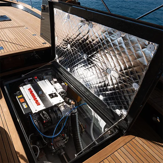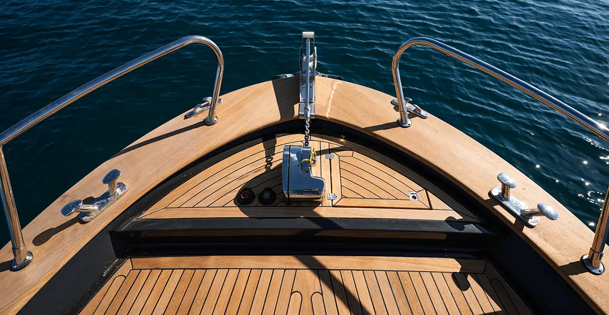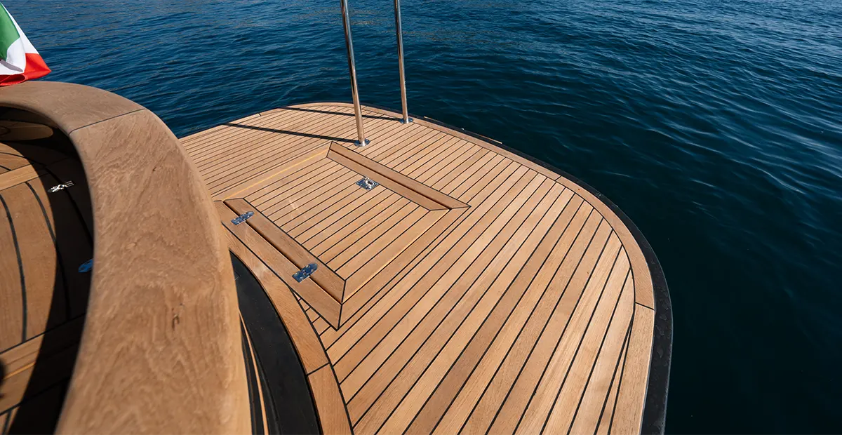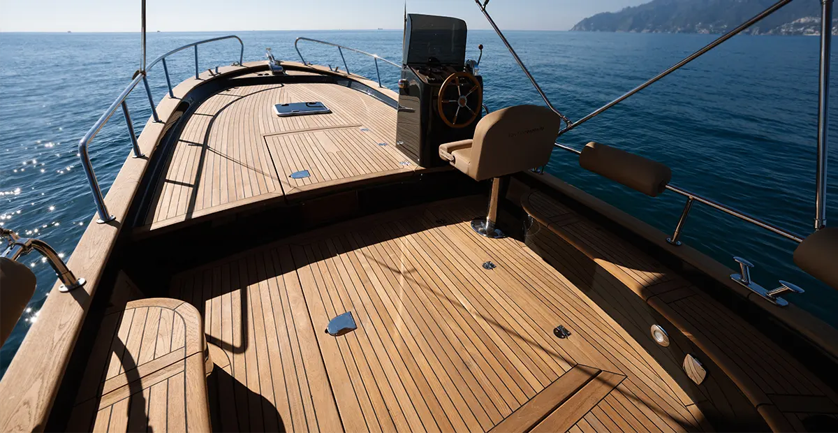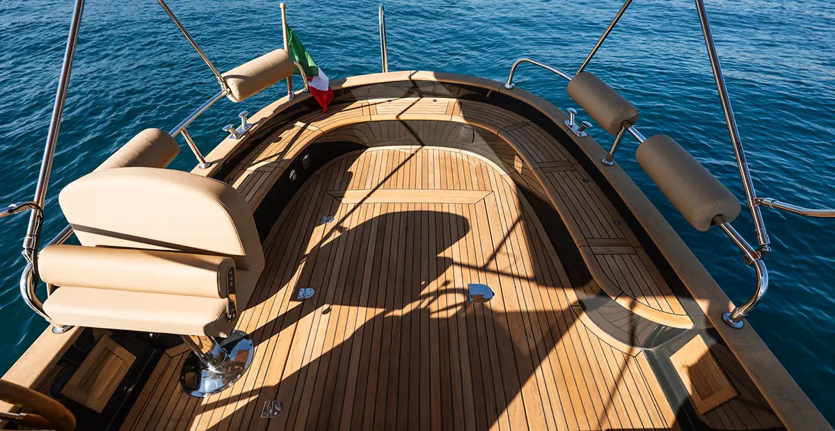 Le dotazioni essenziali — dal musone in acciaio ai tanti gavoni porta oggetti, alla possibilità di rivestire la coperta in teak — completano un’esperienza di bordo elegante e funzionale.