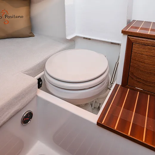 Su richiesta, è possibile aggiungere un WC elettrico con serbatoio acque nere, rendendo ancora più pratico l’utilizzo quotidiano e le brevi uscite fuori porto.