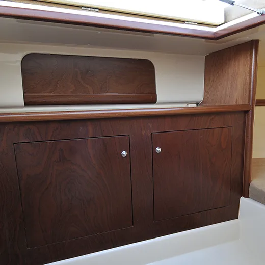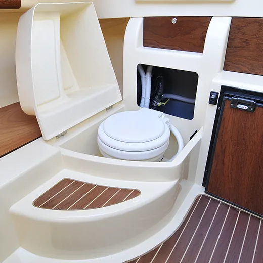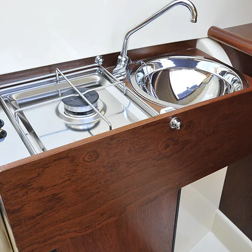 Il mobile a scomparsa con lavello e fornello, insieme al WC marino elettrico perfettamente integrato nella scala di accesso, risponde alle esigenze di chi desidera praticità senza rinunciare all’eleganza. L’eventuale frigorifero completa una dotazione pensata per vivere il mare con leggerezza e totale autonomia.