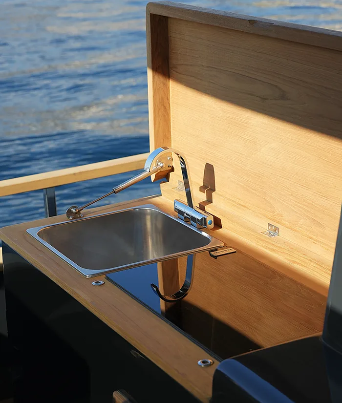 Nell’open space esterno convivono design e praticità: eleganti e comodi passaggi laterali su entrambi i lati, 2 divani passeggeri con ulteriori gavoni, 2 frigoriferi Inox da 65 l, cucina attrezzata con lavello in acciaio e, su richiesta, piano cottura a induzione a due fuochi.