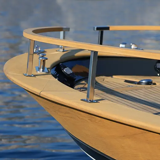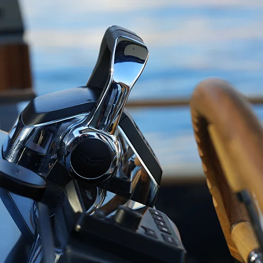 La ruota di timone in Teak naturale sottolinea la perfetta fusione tra artigianalità e innovazione.