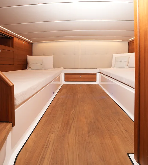 Spaziosa e curata, accoglie due divani letto con cuscini coordinati, vani portaoggetti e oblò che lasciano entrare la luce naturale del mare. Ideale per condividere il viaggio con stile e comodità.