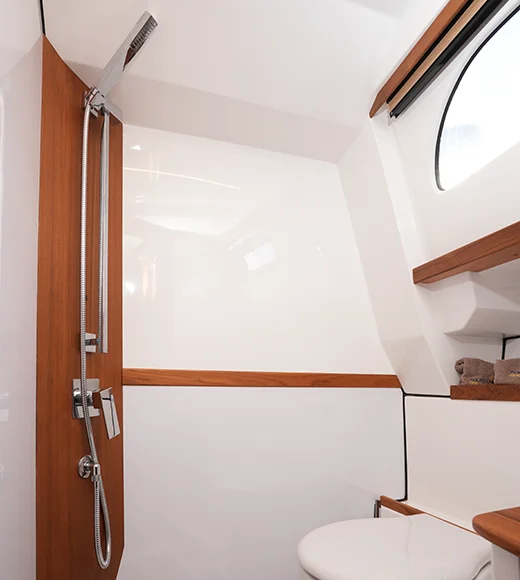 Il bagno è completo di tutto ciò che serve per vivere il mare con libertà: doccia con erogatore estraibile, lavabo con miscelatore acqua calda/fredda, WC elettrico con serbatoio acque nere e pompa maceratore, armadietti, presa 12/220V, illuminazione LED, oblò con tendina oscurante.