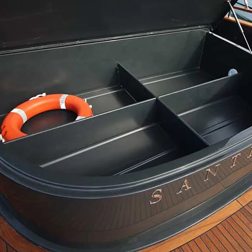 A poppa, un ampio prendisole con gavone sottostante si affaccia su una plancetta in VTR, perfetta per un tuffo in acque cristalline o per godersi il mare da vicino.